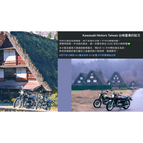 台崎重車預告2026新陣容,W230與Meguro S1有望登台?