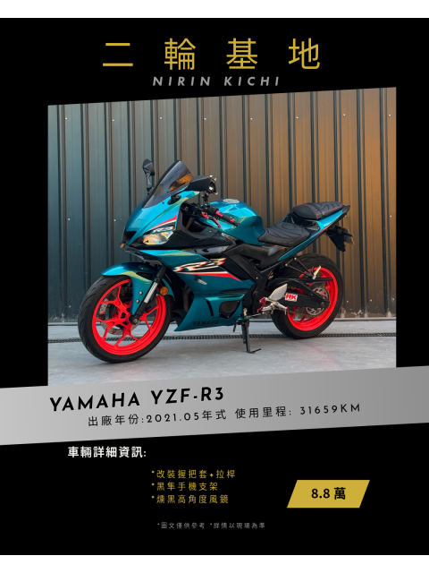 #外型搶眼騎感穩定 YAMAHA YZF-R3 2021.05 年式|使用里程 31,659 km R 系列經典跑車設定,騎姿運動、操控靈活 在小...